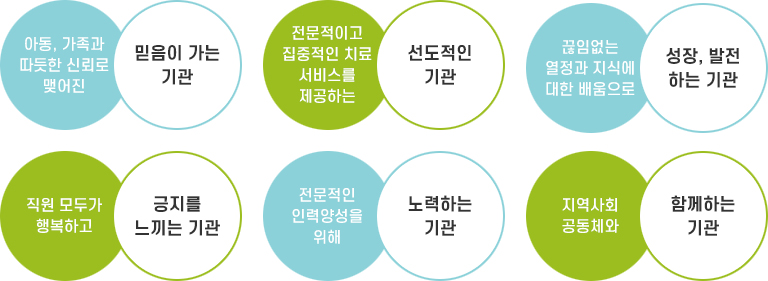 ‘소중한 나, 함께하는 우리’ 라는 슬로건 아래 전문적이고 체계적인 치료 서비스를 통해 아동이 가정과 학교, 지역사회에 적응하도록 돕고